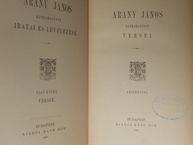 | Megjegyzés | Arany János hátrahagyott versei, prózai dolgozatai és levelezése iró-barátaival I.-IV. |
